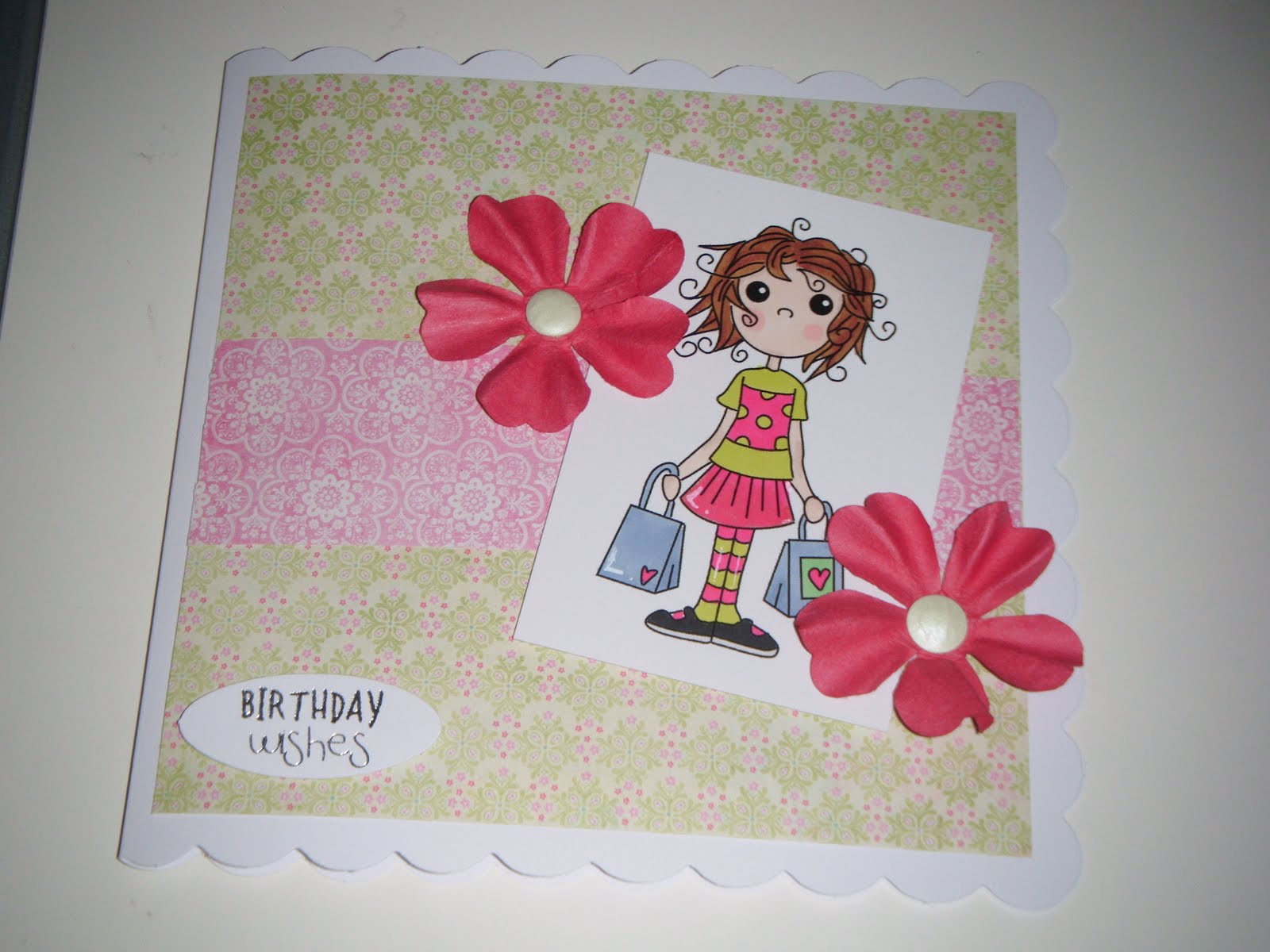 The papers are some that I had left from a freebie in a magazine last year ( I love this colour combo) the image is a pollycraft digi coloured with pro-markers and flowers, card candy and sentiment from stash.